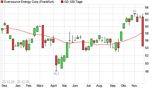 Mit dem Rücksetzer auf 57,00 EUR hat die Eversource Energy-Aktie am 20.11.2025 die 100-Tage-Linie nach unten gekreuzt.Die Eversource Energy-Aktie befindet sich seit dem 22.09.2025 im langfristigen ...weiterlesen