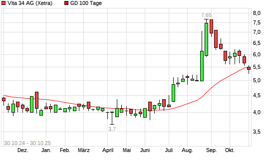Mit dem Rücksetzer auf 5,30 EUR hat die Vita 34-Aktie am 29.10.2025 die 100-Tage-Linie nach unten gekreuzt.Die Vita 34-Aktie befindet sich seit dem 11.06.2025 im langfristigen Aufwärtstrend ...weiterlesen