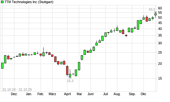Mit dem Anstieg auf 54,00 EUR hat die TTM Technologies-Aktie (ISIN US87305R1095) am 30.10.2025 ein neues All-Time-High erreicht und damit den Kurs vom 29.10.2025 eingestellt.Die TTM Technologies-Aktie ...weiterlesen