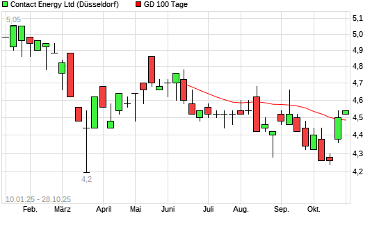 Mit dem Anstieg auf 4,72 EUR hat die Contact Energy-Aktie am 27.10.2025 die 100-Tage-Linie nach oben gekreuzt.Die Contact Energy-Aktie befindet sich seit dem 12.06.2025 im langfristigen Abwärtstrend ...weiterlesen