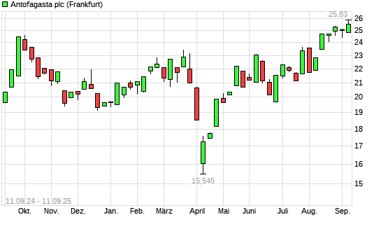 Mit dem Anstieg auf 25,83 EUR hat die Antofagasta-Aktie (ISIN GB0000456144) am 10.09.2025 ein neues 12-Monats-Hoch erreicht und damit den Kurs vom 27.08.2025 eingestellt.Die Antofagasta-Aktie ...weiterlesen