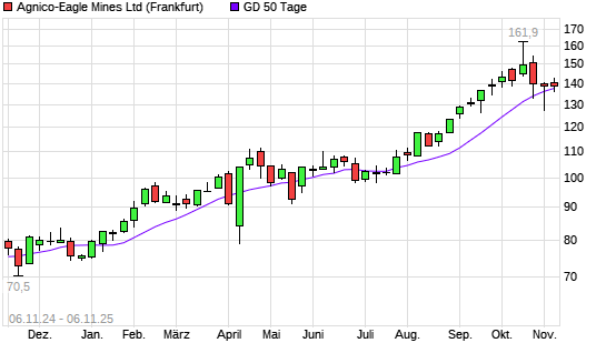 Mit dem Anstieg auf 139,05 EUR hat die Agnico-Eagle Mines-Aktie am 05.11.2025 die 50-Tage-Linie nach oben gekreuzt.Die Agnico-Eagle Mines-Aktie befindet sich seit dem 04.03.2024 im langfristigen ...weiterlesen