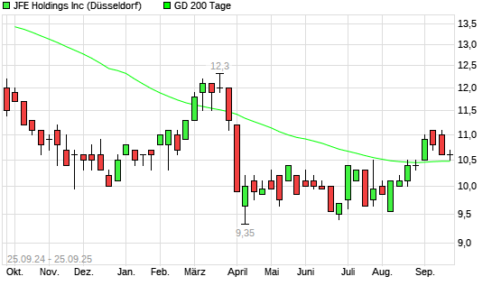 Mit dem Anstieg auf 10,70 EUR hat die JFE Holdings-Aktie am 24.09.2025 die 200-Tage-Linie nach oben gekreuzt.Die JFE Holdings-Aktie befand sich seit dem 23.09.2025 im langfristigen Abwärtstrend ...weiterlesen