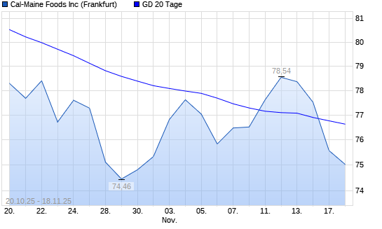 Mit dem Rücksetzer auf 75,58 EUR hat die Cal-Maine Foods-Aktie am 17.11.2025 die 20-Tage-Linie nach unten gekreuzt.Die Cal-Maine Foods-Aktie befindet sich seit dem 16.09.2025 im langfristigen ...weiterlesen