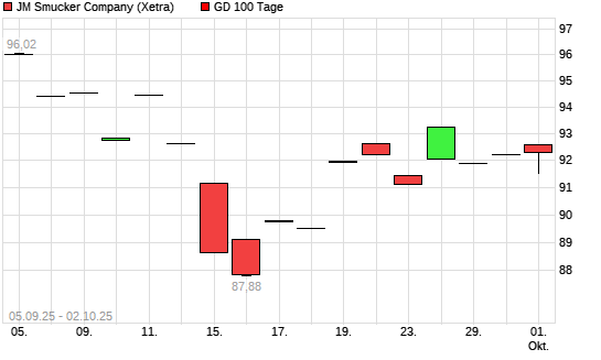 Mit dem Anstieg auf 92,40 EUR hat die J.M. Smucker Company-Aktie am 01.10.2025 die 100-Tage-Linie nach oben gekreuzt.Die J.M. Smucker Company-Aktie befindet sich seit dem 07.04.2025 im langfristigen ...weiterlesen