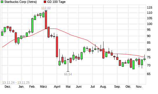 Mit dem Anstieg auf 75,36 EUR hat die Starbucks-Aktie am 12.11.2025 die 100-Tage-Linie nach oben gekreuzt.Die Starbucks-Aktie befindet sich seit dem 03.04.2025 im langfristigen Abwärtstrend ...weiterlesen
