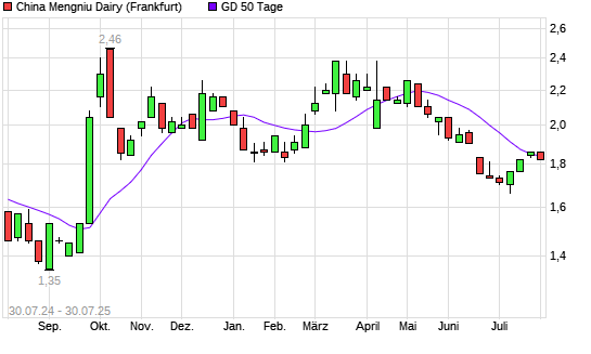 Mit dem Rücksetzer auf 1,82 EUR hat die China Mengniu Dairy-Aktie am 29.07.2025 die 50-Tage-Linie nach unten gekreuzt.Die China Mengniu Dairy-Aktie befindet sich seit dem 27.05.2025 im ...weiterlesen