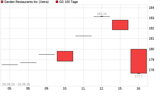 Mit dem Rücksetzer auf 180,65 EUR hat die Darden Restaurants-Aktie am 15.09.2025 die 100-Tage-Linie nach unten gekreuzt.Die Darden Restaurants-Aktie befindet sich seit dem 10.09.2025 im ...weiterlesen