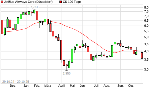 Mit dem Rücksetzer auf 3,50 EUR hat die JetBlue Airways-Aktie am 28.10.2025 die 100-Tage-Linie nach unten gekreuzt.Die JetBlue Airways-Aktie befindet sich seit dem 04.03.2025 im langfristigen ...weiterlesen