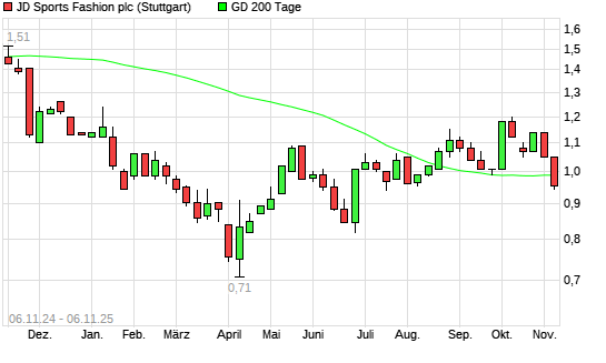 Mit dem Rücksetzer auf 0,95 EUR hat die JD Sports Fashion-Aktie am 05.11.2025 die 200-Tage-Linie nach unten gekreuzt.Die JD Sports Fashion-Aktie befand sich seit dem 20.08.2025 im langfristigen ...weiterlesen
