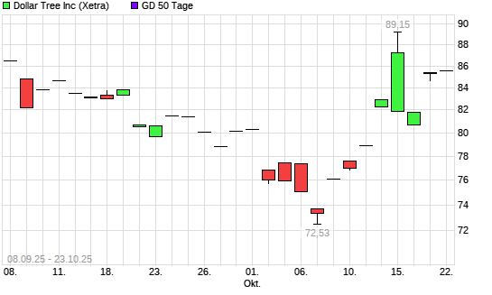 Mit dem Anstieg auf 86,39 EUR hat die Dollar Tree-Aktie am 22.10.2025 die 50-Tage-Linie nach oben gekreuzt.Die Dollar Tree-Aktie befindet sich seit dem 13.10.2025 im langfristigen Aufwärtstrend ...weiterlesen