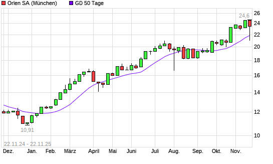 Mit dem Anstieg auf 23,29 EUR hat die Polski Koncern Naftowy Orlen-Aktie am 21.11.2025 die 50-Tage-Linie nach oben gekreuzt.Die Polski Koncern Naftowy Orlen-Aktie befindet sich seit dem 11.02.2025 ...weiterlesen