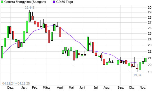 Mit dem Anstieg auf 20,36 EUR hat die Cabot Oil & Gas-Aktie am 03.11.2025 die 50-Tage-Linie nach oben gekreuzt.Die Cabot Oil & Gas-Aktie befindet sich seit dem 07.04.2025 im langfristigen ...weiterlesen
