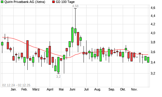 Mit dem Anstieg auf 3,46 EUR hat die quirin bank-Aktie am 01.12.2025 die 100-Tage-Linie nach oben gekreuzt.Die quirin bank-Aktie befindet sich seit dem 31.10.2025 im langfristigen Abwärtstrend ...weiterlesen