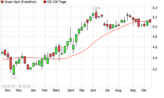 Mit dem Rücksetzer auf 5,09 EUR hat die Snam-Aktie am 15.10.2025 die 100-Tage-Linie nach unten gekreuzt.Die Snam-Aktie befindet sich seit dem 07.03.2025 im langfristigen Aufwärtstrend und ...weiterlesen