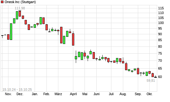 Mit dem Rücksetzer auf 59,37 EUR hat die ONEOK-Aktie (ISIN US6826801036) am 14.10.2025 ein neues 12-Monats-Tief erreicht und damit den Kurs vom 13.10.2025 eingestellt.Die ONEOK-Aktie befindet ...weiterlesen