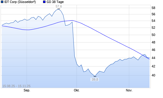 Mit dem Rücksetzer auf 43,88 EUR hat die IDT-Aktie am 14.11.2025 die 38-Tage-Linie nach unten gekreuzt.Die IDT-Aktie befindet sich seit dem 01.10.2025 im langfristigen Abwärtstrend und ...weiterlesen