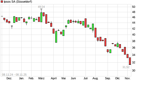 Mit dem Rücksetzer auf 31,62 EUR hat die Ipsos-Aktie (ISIN FR0000073298) am 07.11.2025 ein neues 3-Jahres-Tief erreicht und damit den Kurs vom 06.11.2025 eingestellt.Die Ipsos-Aktie befindet ...weiterlesen