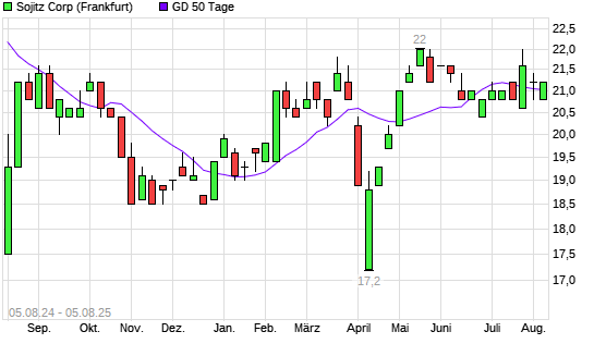 Mit dem Rücksetzer auf 20,80 EUR hat die Sojitz-Aktie am 04.08.2025 die 50-Tage-Linie nach unten gekreuzt.Die Sojitz-Aktie befindet sich seit dem 28.04.2025 im langfristigen Aufwärtstrend ...weiterlesen