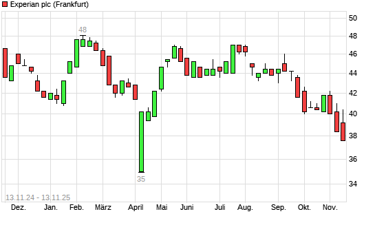 Mit dem Rücksetzer auf 37,60 EUR hat die Experian-Aktie (ISIN GB00B19NLV48) am 12.11.2025 ein neues 6-Monats-Tief erreicht und damit den Kurs vom 07.11.2025 eingestellt.Die Experian-Aktie ...weiterlesen