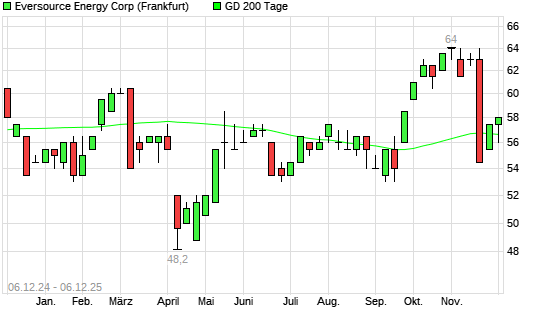 Mit dem Anstieg auf 58,00 EUR hat die Eversource Energy-Aktie am 05.12.2025 die 200-Tage-Linie nach oben gekreuzt.Die Eversource Energy-Aktie befand sich seit dem 03.12.2025 im langfristigen ...weiterlesen