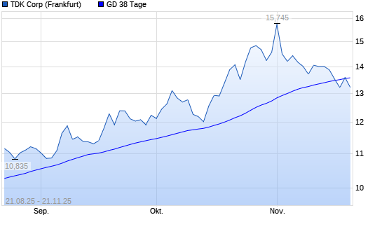 Mit dem Anstieg auf 13,58 EUR hat die TDK-Aktie am 20.11.2025 die 38-Tage-Linie nach oben gekreuzt.Die TDK-Aktie befindet sich seit dem 05.08.2025 im langfristigen Aufwärtstrend und hat in diesem ...weiterlesen
