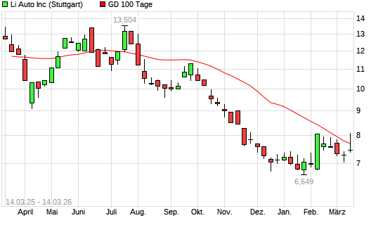 Mit dem Rücksetzer auf 7,43 EUR hat die LI AUTO CL.A-Aktie am 13.03.2026 die 100-Tage-Linie nach unten gekreuzt.Die LI AUTO CL.A-Aktie befindet sich seit dem 30.07.2025 ...weiterlesen