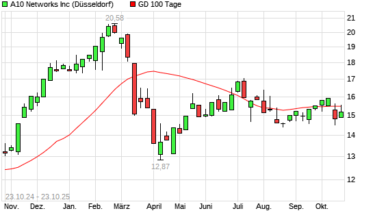 Mit dem Rücksetzer auf 15,21 EUR hat die A10 Networks-Aktie am 22.10.2025 die 100-Tage-Linie nach unten gekreuzt.Die A10 Networks-Aktie befindet sich seit dem 10.07.2025 im langfristigen ...weiterlesen
