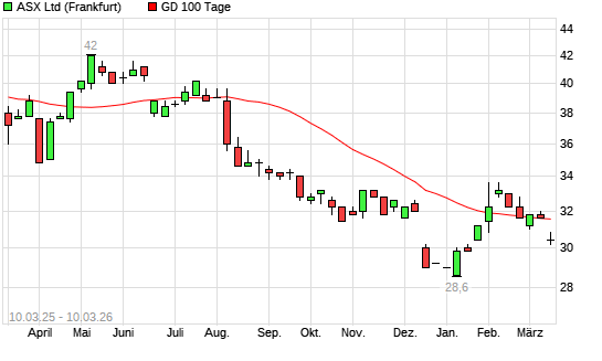 Mit dem Rücksetzer auf 30,80 EUR hat die ASX-Aktie am 09.03.2026 die 100-Tage-Linie nach unten gekreuzt.Die ASX-Aktie befindet sich seit dem 07.08.2025 im langfristigen ...weiterlesen
