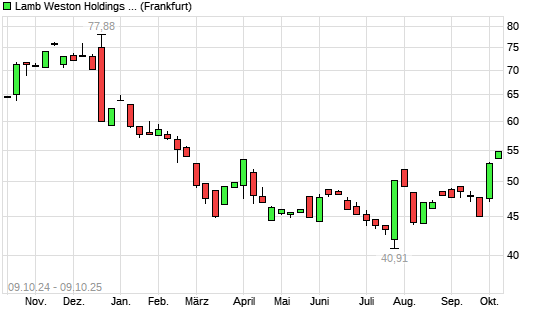 Mit dem Anstieg auf 54,28 EUR hat die Lamb Weston-Aktie (ISIN US5132721045) am 08.10.2025 ein neues 6-Monats-Hoch erreicht und damit den Kurs vom 07.10.2025 eingestellt.Die Lamb Weston-Aktie ...weiterlesen