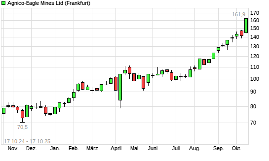 Mit dem Anstieg auf 158,55 EUR hat die Agnico-Eagle Mines-Aktie (ISIN CA0084741085) am 16.10.2025 ein neues All-Time-High erreicht und damit den Kurs vom 15.10.2025 eingestellt.Die Agnico-Eagle ...weiterlesen