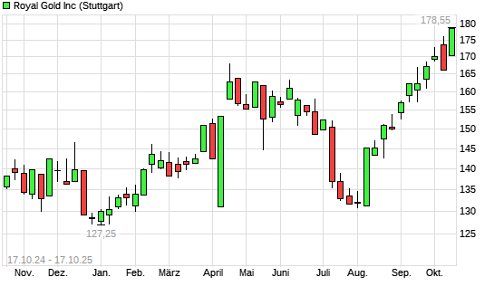 Mit dem Anstieg auf 176,35 EUR hat die Royal Gold-Aktie (ISIN US7802871084) am 16.10.2025 ein neues All-Time-High erreicht und damit den Kurs vom 08.10.2025 eingestellt.Die Royal Gold-Aktie ...weiterlesen