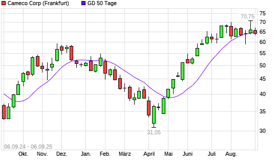 Mit dem Rücksetzer auf 64,31 EUR hat die Cameco-Aktie am 05.09.2025 die 50-Tage-Linie nach unten gekreuzt.Die Cameco-Aktie befindet sich seit dem 09.05.2025 im langfristigen Aufwärtstrend ...weiterlesen