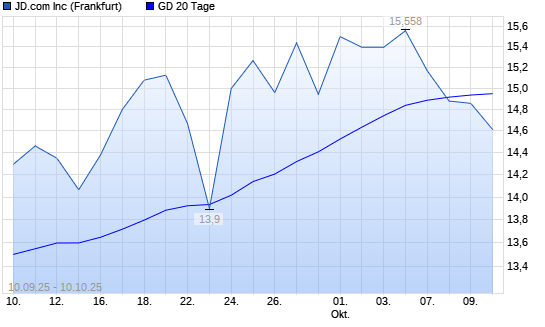 Mit dem Anstieg auf 14,98 EUR hat die JD.com A-Aktie am 09.10.2025 die 20-Tage-Linie nach oben gekreuzt.Die JD.com A-Aktie befindet sich seit dem 14.04.2025 im langfristigen Abwärtstrend und ...weiterlesen
