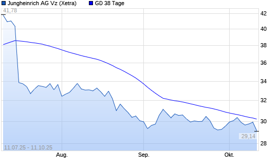 Mit dem Rücksetzer auf 29,72 EUR hat die Jungheinrich Vz-Aktie am 10.10.2025 die 38-Tage-Linie nach unten gekreuzt.Die Jungheinrich Vz-Aktie befindet sich seit dem 26.08.2025 im langfristigen ...weiterlesen