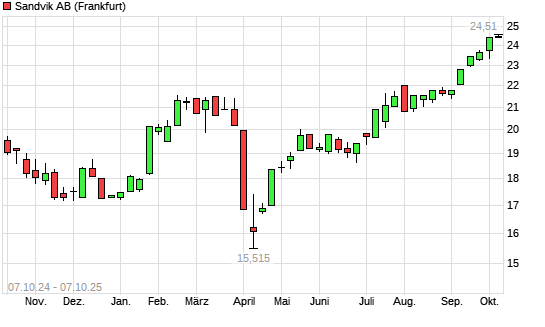 Mit dem Anstieg auf 24,51 EUR hat die Sandvik-Aktie (ISIN SE0000667891) am 06.10.2025 ein neues 3-Jahres-Hoch erreicht und damit den Kurs vom 03.10.2025 eingestellt.Die Sandvik-Aktie befindet ...weiterlesen