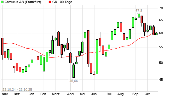 Mit dem Anstieg auf 60,50 EUR hat die Camurus Ord Shs-Aktie am 22.10.2025 die 100-Tage-Linie nach oben gekreuzt.Die Camurus Ord Shs-Aktie befindet sich seit dem 24.06.2025 im langfristigen Aufwärtstrend ...weiterlesen