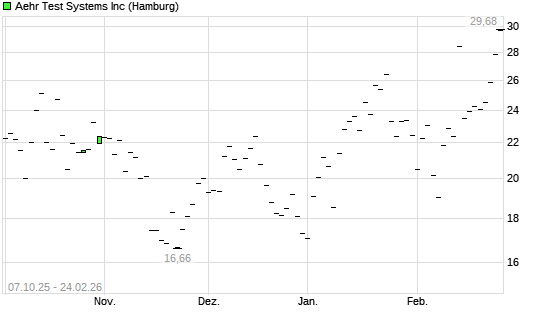 Mit dem Anstieg auf 29,90 EUR hat die Aehr Test Systems-Aktie (ISIN US00760J1088) am 23.02.2026 ein neues 12-Monats-Hoch erreicht und damit den Kurs vom 11.02.2026 eingestellt.Die ...weiterlesen