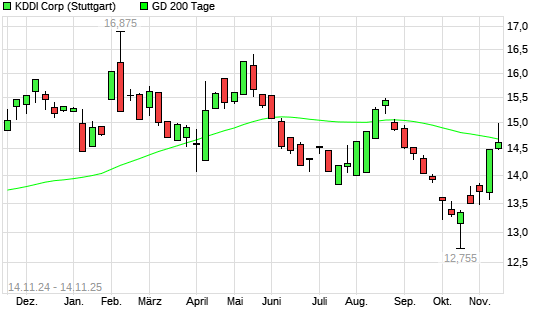 Mit dem Rücksetzer auf 14,56 EUR hat die KDDI-Aktie am 13.11.2025 die 200-Tage-Linie nach unten gekreuzt.Die KDDI-Aktie befand sich seit dem 11.11.2025 im langfristigen Aufwärtstrend und ...weiterlesen