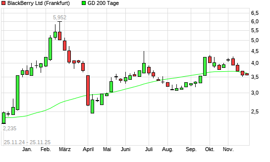 Mit dem Anstieg auf 3,62 EUR hat die Blackberry-Aktie am 24.11.2025 die 200-Tage-Linie nach oben gekreuzt.Die Blackberry-Aktie befand sich seit dem 21.11.2025 im langfristigen Abwärtstrend und ...weiterlesen