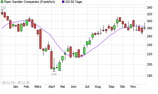 Mit dem Anstieg auf 296,00 EUR hat die Piper Sandler-Aktie am 27.11.2025 die 50-Tage-Linie nach oben gekreuzt.Die Piper Sandler-Aktie befindet sich seit dem 17.07.2025 im langfristigen Aufwärtstrend ...weiterlesen