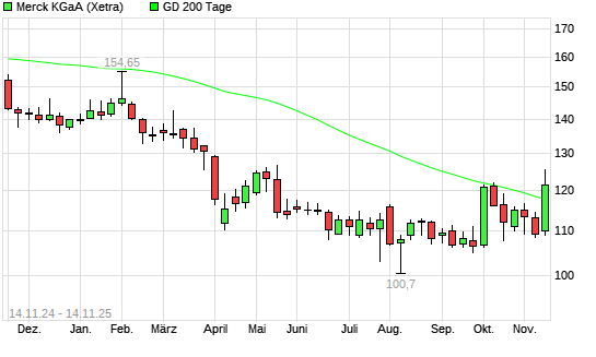 Mit dem Anstieg auf 120,65 EUR hat die Merck-Aktie am 13.11.2025 die 200-Tage-Linie nach oben gekreuzt.Die Merck-Aktie befand sich seit dem 24.10.2024 im langfristigen Aufwärtstrend und hat ...weiterlesen