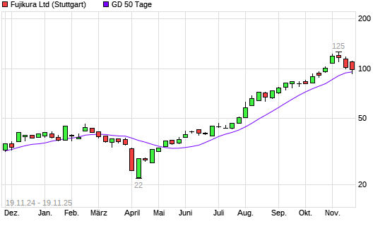 Mit dem Rücksetzer auf 95,60 EUR hat die Fujikura-Aktie am 18.11.2025 die 50-Tage-Linie nach unten gekreuzt.Die Fujikura-Aktie befindet sich seit dem 02.05.2025 im langfristigen Aufwärtstrend ...weiterlesen