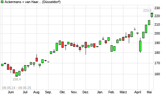 Mit dem Anstieg auf 223,60 EUR hat die Ackermans + van Haaren-Aktie (ISIN BE0003764785) am 08.05.2025 ein neues All-Time-High erreicht und damit den Kurs vom 07.05.2025 eingestellt.Die Ackermans ...weiterlesen