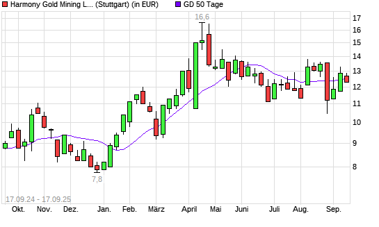 Mit dem Anstieg auf 12,65 EUR hat die Harmony Gold Mining-Aktie am 16.09.2025 die 50-Tage-Linie nach oben gekreuzt.Die Harmony Gold Mining-Aktie befindet sich seit dem 01.09.2025 im langfristigen ...weiterlesen