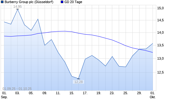 Mit dem Anstieg auf 13,40 EUR hat die Burberry Group-Aktie am 30.09.2025 die 20-Tage-Linie nach oben gekreuzt.Die Burberry Group-Aktie befindet sich seit dem 14.05.2025 im langfristigen Aufwärtstrend ...weiterlesen