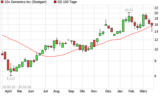 Mit dem Anstieg auf 15,82 EUR hat die 10x Genomics-Aktie am 19.03.2026 die 100-Tage-Linie nach oben gekreuzt.Die 10x Genomics-Aktie befindet sich seit dem 17.10.2025 im ...weiterlesen