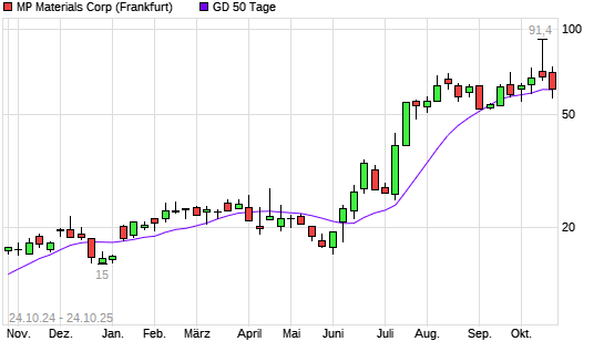 Mit dem Rücksetzer auf 58,80 EUR hat die MP Materials-Aktie am 23.10.2025 die 50-Tage-Linie nach unten gekreuzt.Die MP Materials-Aktie befindet sich seit dem 04.06.2025 im langfristigen ...weiterlesen