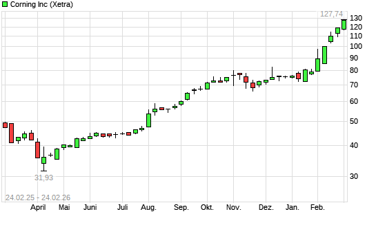Mit dem Anstieg auf 121,74 EUR hat die Corning-Aktie (ISIN US2193501051) am 23.02.2026 ein neues 10-Jahres-Hoch erreicht und damit den Kurs vom 20.02.2026 eingestellt.Die ...weiterlesen
