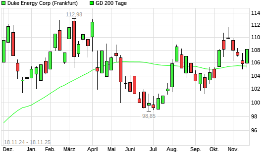 Mit dem Rücksetzer auf 105,20 EUR hat die Duke Energy-Aktie am 17.11.2025 die 200-Tage-Linie nach unten gekreuzt.Die Duke Energy-Aktie befand sich seit dem 06.10.2025 im langfristigen Abwärtstrend ...weiterlesen
